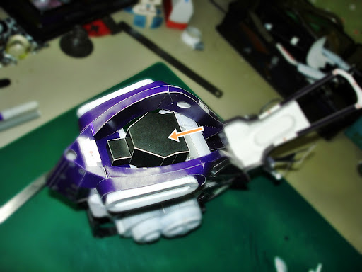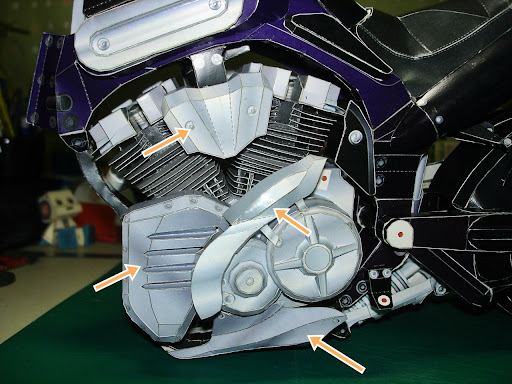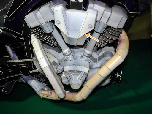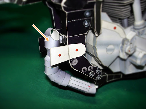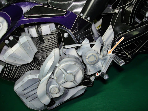 ภาพขยายในส่วนของขาตั้งนั้นจากแบบเดิมที่ได้มา ขาตั้งจะถูกประกอบในลักษณะพับเก็บเอาไว้ แต่จากการที่ได้ประกอบเสร็จถึงได้รู้ว่า แม้รถจะมีล้อหลังที่ใหญ่ สามารถที่จะทรงตัวเองได้โดยไม่ต้องใช้ขาตั้ง แต่ชุดบังคับล้อหน้านั้นสามารถที่จะปรับหมุนซ้ายขวาได้ จึงทำให้การทรงตัวของรถนั้นทำได้ไม่ดีพอ สามารถที่จะล้มลงได้ง่าย ดังนั้นการจึงทำการประกอบขาตั้งในลักษณะเหยียดลงกับพื้นเพื่อพยุงตัวรถ และให้อารมณ์ความรู้สึกของรถที่จอดเอาไว้มากกว่าที่จะให้ตัวรถจอดอยู่นิ่งๆ ในอาการที่ตั้งเด่ตรงๆ โดยที่ไม่มีอะไรค้ำเอาไว้